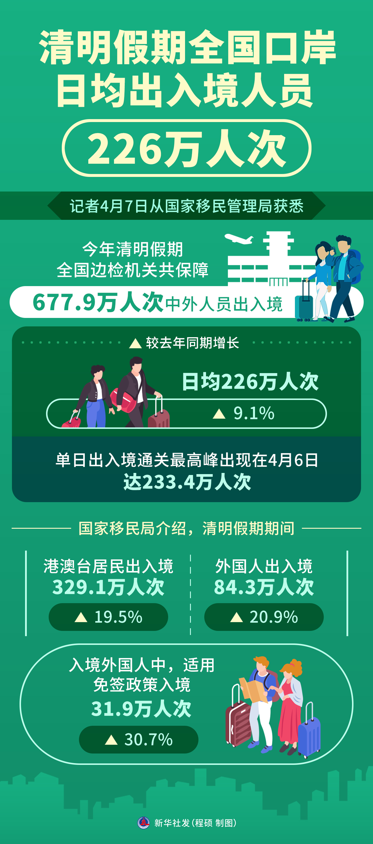 记者4月7日从国家移民管理局获悉,今年清明假期全国边检机关共保障677.9万人次中外人员出入境,日均226万人次,较去年同期增长9.1%;单日出入境通关最高峰出现在4月6日,达233.4万人次。