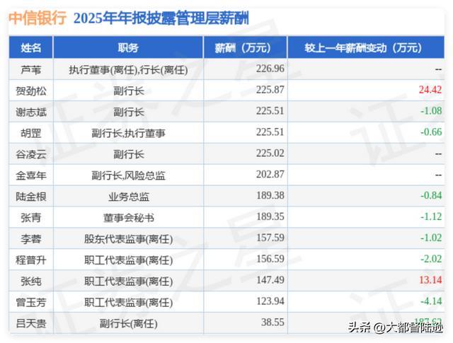 中信银行原行长刘成2024年的薪酬是274.59万元,2025年上任的芦苇拿了226.96万元。